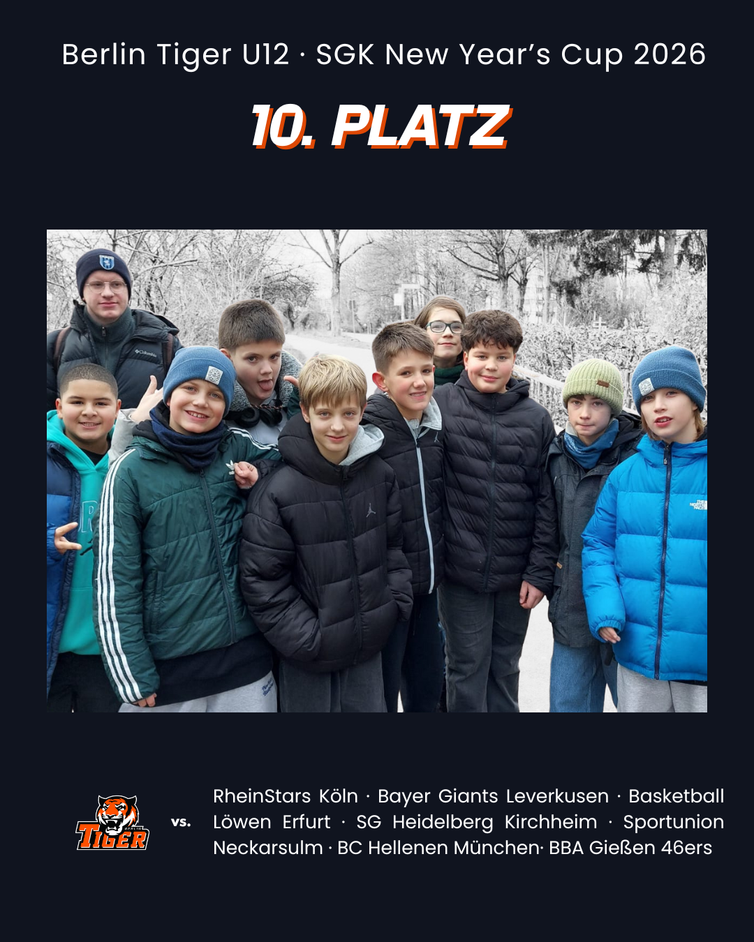 Für die U12 ging es in diesem Jahr zum SGK (SG Kirchheim) New Year’s Cup, einem seit einigen Jahren etablierten, hervorragend besetzten U12-Turnier. Jedes Jahr schicken dort einige der sportlich besten Jugendprogramme aus ganz Deutschland – von Ulm über Bamberg bis nach Berlin – ihre Teams an den Start. Wir wurden eingeladen, nachdem sich die Heidelberger sehr begeistert von unserem Tiger-Turnier gezeigt hatten.